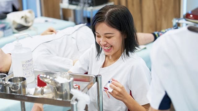 はりの持ち方から刺し方、きゅうの作り方をマスター。361カ所あるツボの名称と位置を1年次で確実に覚えます。